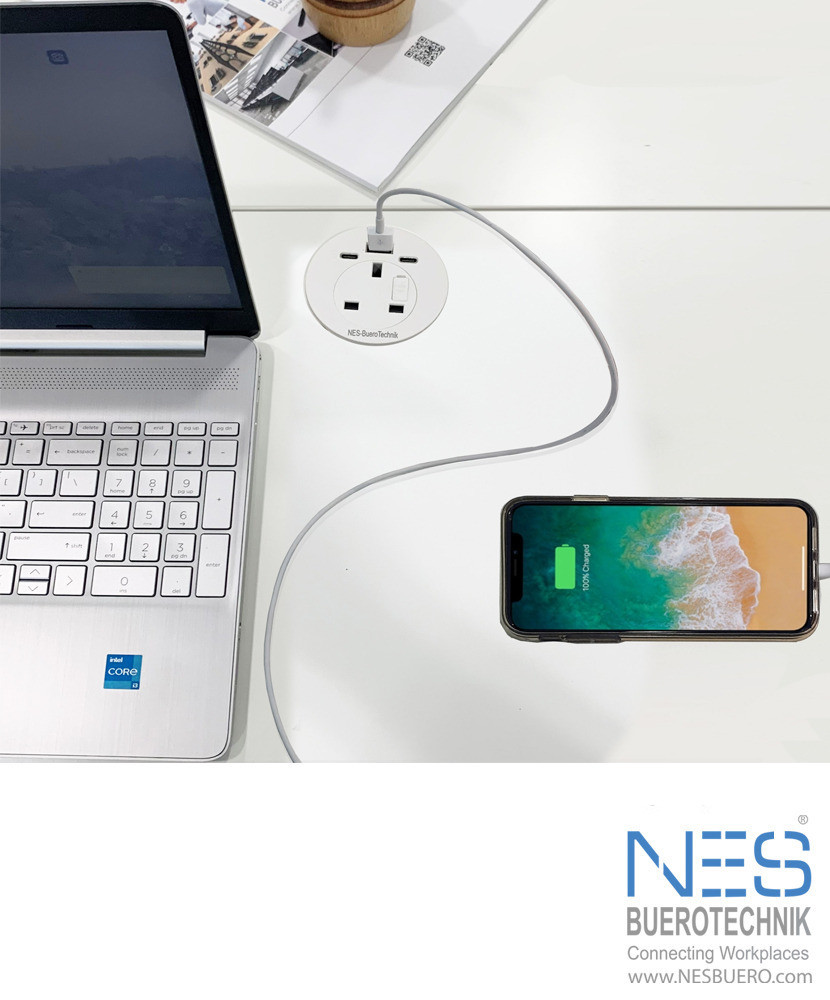 NES BueroTechnik Propint 60 . The ergonomic power data Grommet which contains: Cat6 Keystone Data Points, Universal Socket (UK, Schucko, I, F), and USB 2.0 connector. Standard diameter 60 mm,